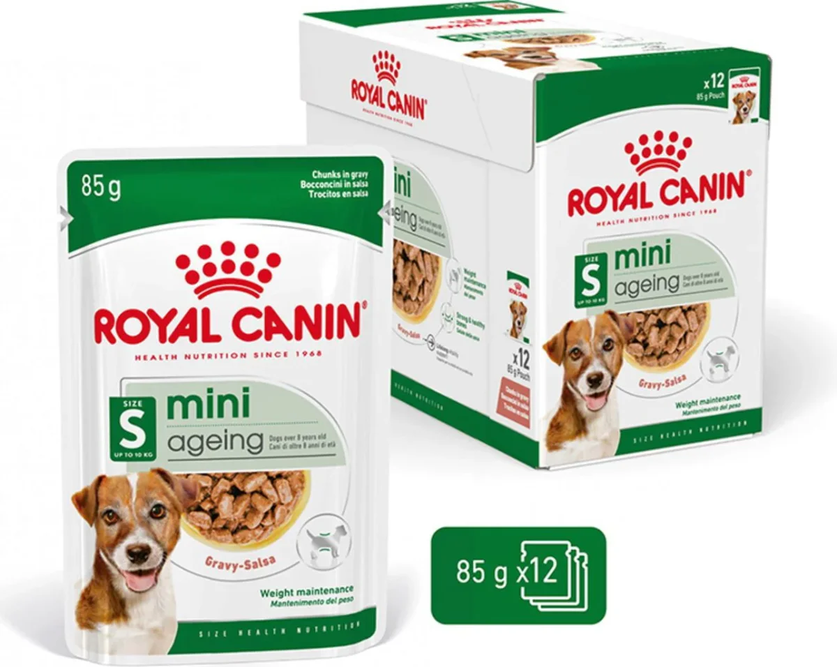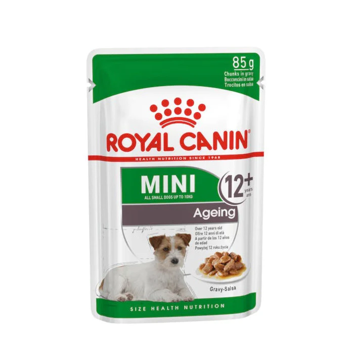 Royal Canin Mini Ageing 12×85 Gr è un alimento per cani anziani di piccola taglia che offre una nutrizione completa e bilanciata per supportare la salute e il benessere del tuo cane.