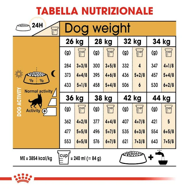 La razione giornaliera varia in base al peso e all’attività del cane. Ad esempio, un Pastore Tedesco di 32 kg con attività normale dovrebbe consumare circa 332 grammi al giorno. Si consiglia di consultare la tabella nutrizionale sulla confezione per adattare la quantità in base alle esigenze specifiche del cane.