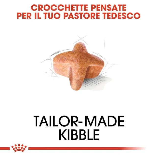 Royal Canin German Shepherd Adult è un alimento secco completo appositamente formulato per soddisfare le esigenze nutrizionali dei Pastori Tedeschi adulti a partire dai 15 mesi di età . Questo alimento è studiato per promuovere una digestione ottimale, supportare la salute della pelle e del pelo e mantenere la salute delle ossa e delle articolazioni. La crocchetta è disegnata su misura per adattarsi alla forma della mascella del Pastore Tedesco, facilitando la masticazione e migliorando la digestione.