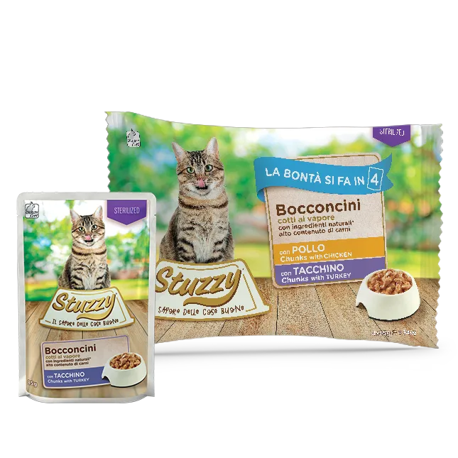 Il Multipack Stuzzy Bocconcini per Gatti Sterilizzati con Pollo e Tacchino è una selezione di alimenti umidi completi per gatti sterilizzati, realizzato con ingredienti naturali e cotti al vapore per preservare i nutrienti e il sapore. Questo multipack offre due varianti gustose – bocconcini con pollo e bocconcini con tacchino – entrambe ricche di carne, per deliziare il palato del tuo gatto sterilizzato ad ogni pasto. La ricetta bilanciata garantisce un pasto sano e nutriente, ideale per mantenere la salute e il benessere del tuo felino. Ogni busta da 85g è preparata con ingredienti di alta qualità, assicurando un pasto completo e gustoso.