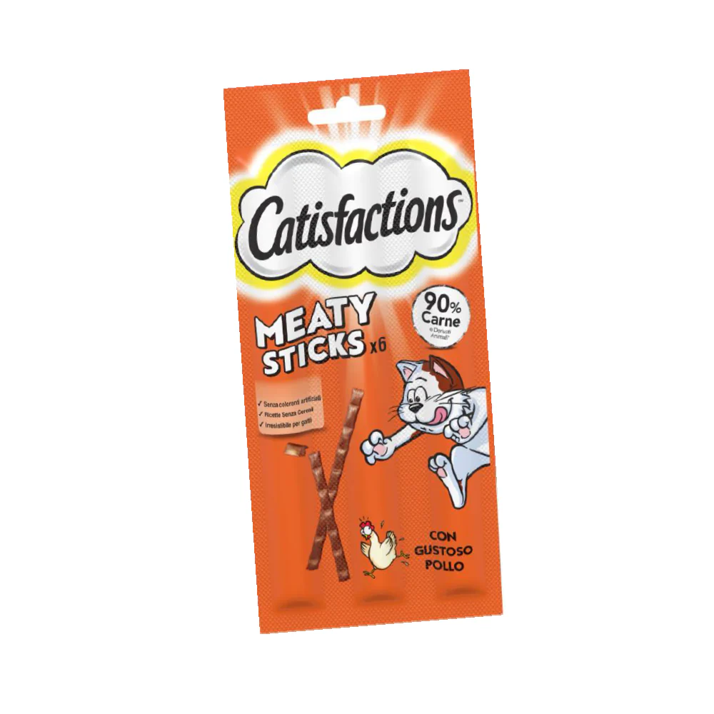 I Catisfactions Meaty Sticks Pollo sono deliziosi snack per gatti progettati per offrire un’esperienza gustativa irresistibile al tuo felino. Questi stuzzichini sono ideali come ricompensa o semplicemente come una coccola speciale durante la giornata. Realizzati con ingredienti di alta qualità , i Meaty Sticks sono arricchiti con un intenso sapore di pollo che soddisferà anche i palati più esigenti. Grazie alla loro consistenza morbida e irresistibile, sono facili da masticare e perfetti per tutti i gatti, compresi quelli più anziani o con difficoltà di masticazione. CATISFACTIONS si impegna a offrire prodotti che non solo attirano l’interesse del tuo gatto, ma che contribuiscono anche al suo benessere generale.