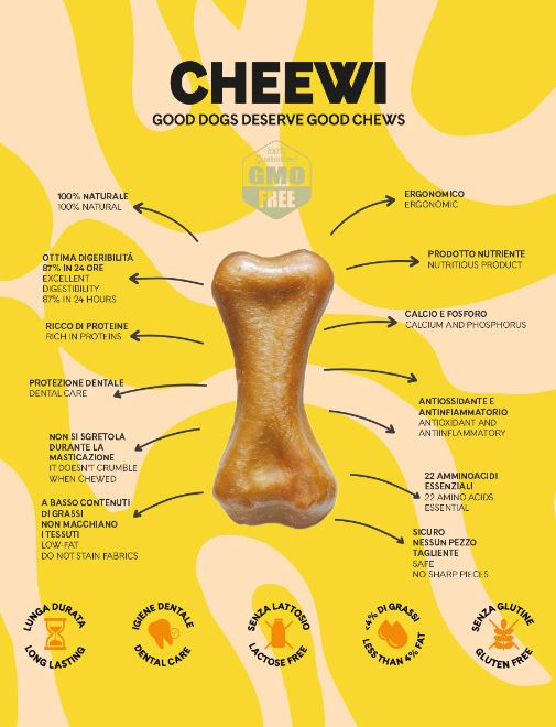 Cheewi è lo snack perfetto per cani di peso compreso tra 3 e 10 kg, con aroma al pollo, 100% naturale e altamente digeribile (87% in 24 ore). Ricco di proteine e privo di glutine e lattosio, è ideale per cani con sensibilità alimentari. Progettato per favorire l’igiene dentale, garantisce una masticazione sicura e piacevole.