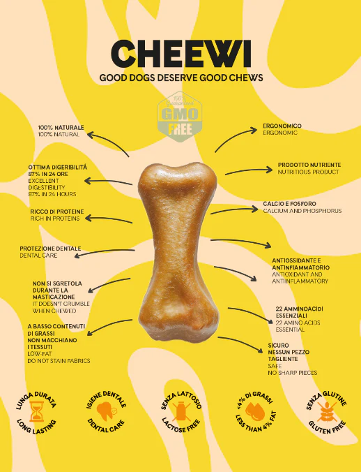 Cheewi è uno snack 100% naturale e di lunga durata, ideale per favorire l’igiene dentale dei cani. Arricchito con aroma al burro di arachidi, è altamente digeribile (87% in 24 ore) e ricco di proteine. La formulazione sicura ed ergonomica lo rende perfetto per ogni razza. Senza glutine e lattosio, contiene meno del 4% di grassi.