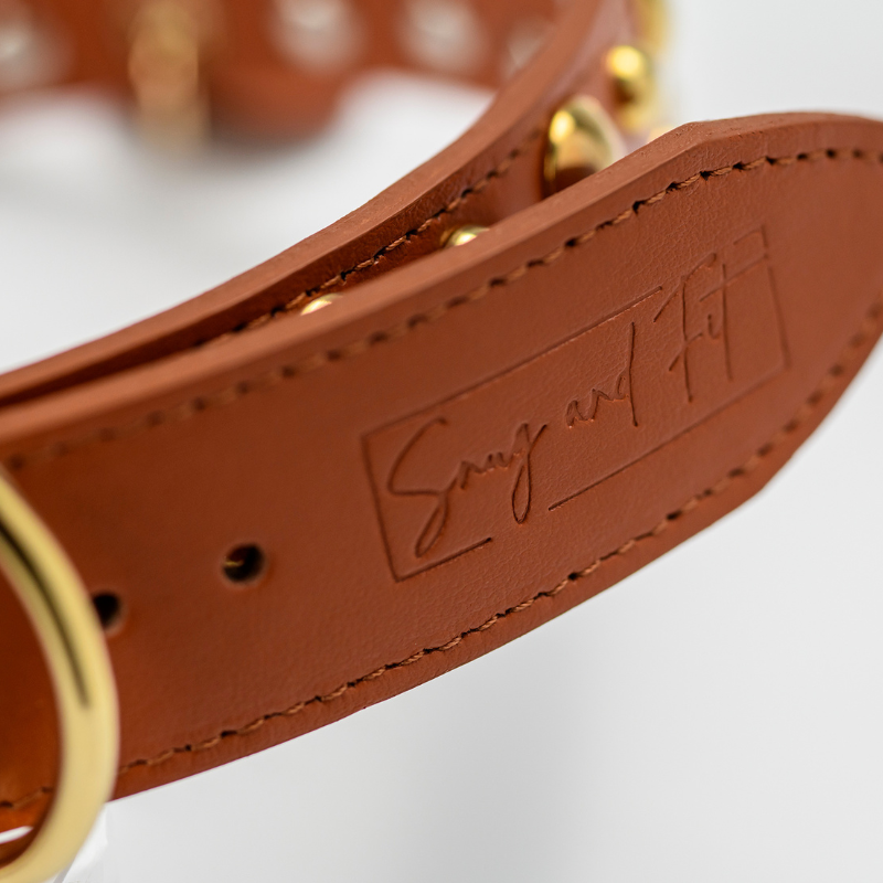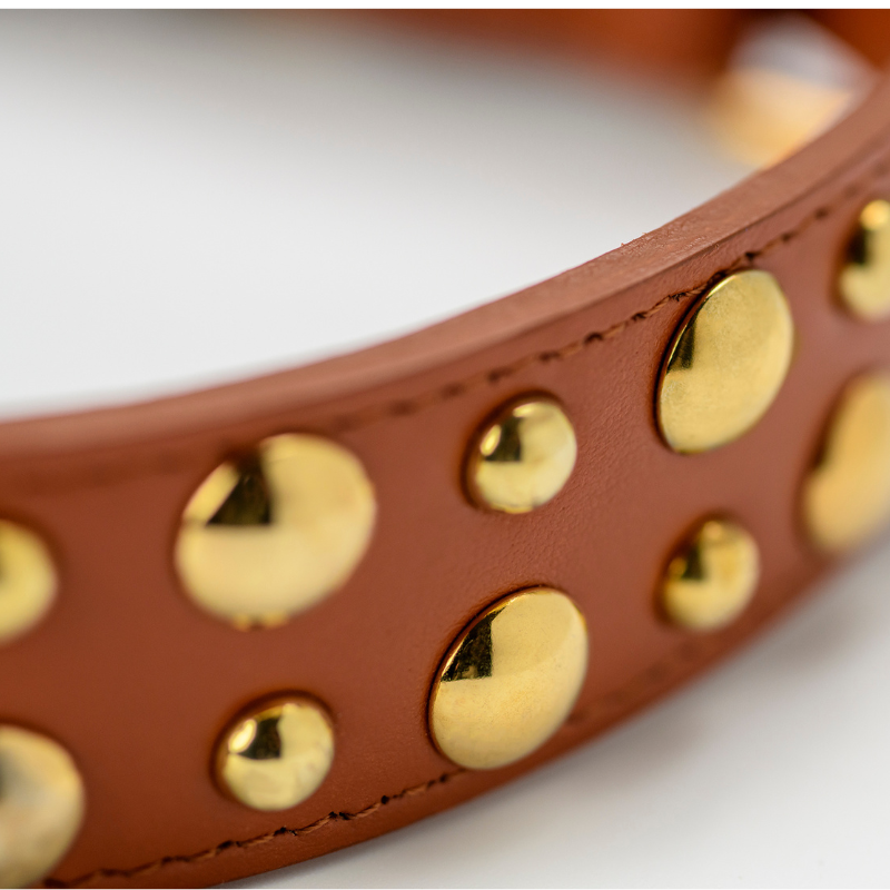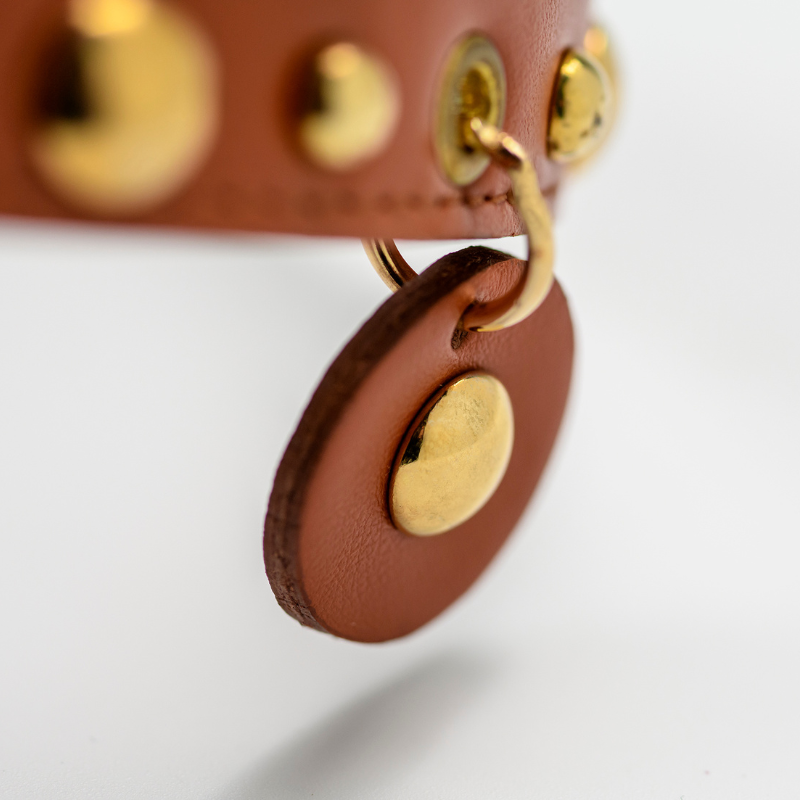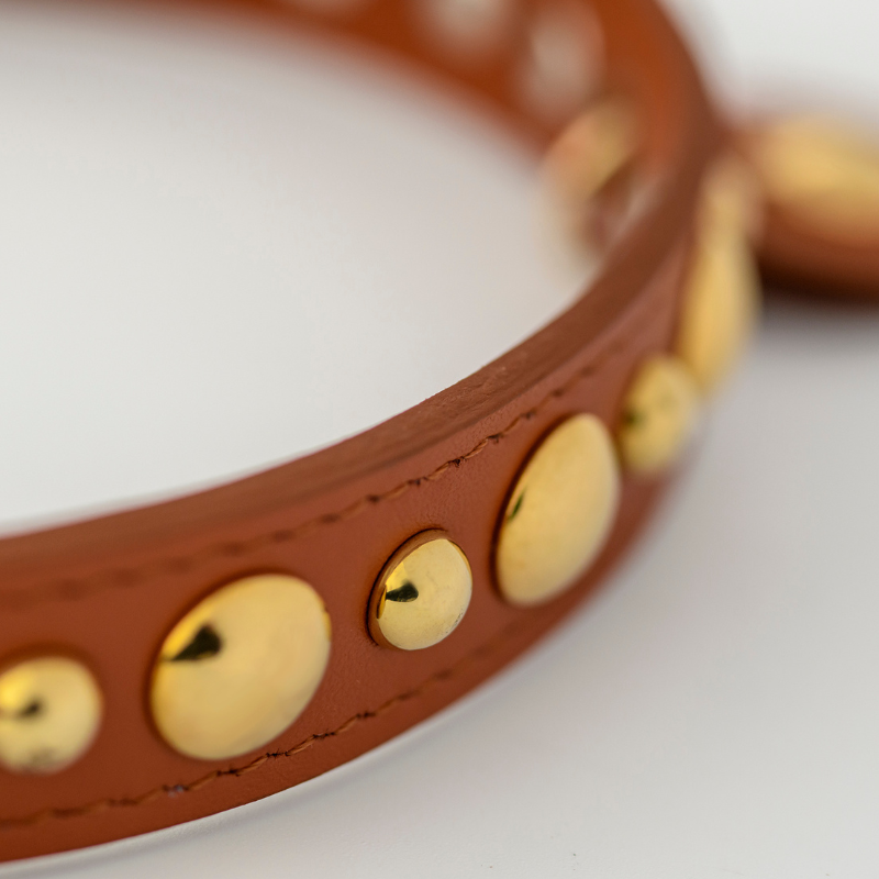 Collare cane Linea Globe, in vera pelle, colore cuoio, con sfere oro, elegante e chic.