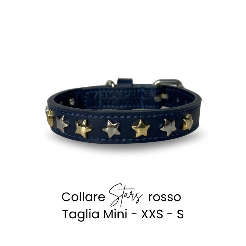 Il nuovo Collare cane STARS in vera pelle blu con borchie a stella argentate e dorate è un must per le occasioni speciali. Il tuo amico sarà bellissimo ed elegantissimo!  Abbinabile al guinzaglio, al porta sacchetti e al braccialetto per il padrone!