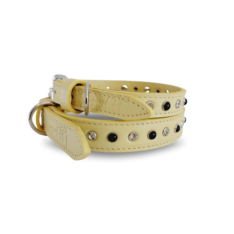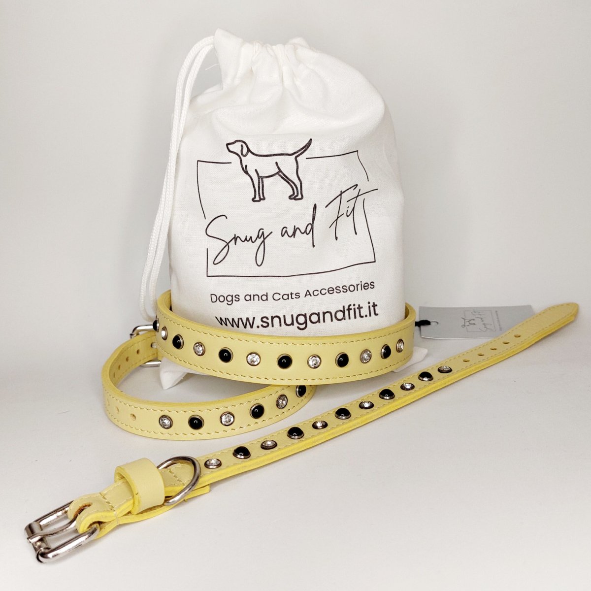 Collare cane Snug and Fit, Linea Dew, in Vera Pelle, Made in Italy, colore giallo, con borchie pietra nera e strass.