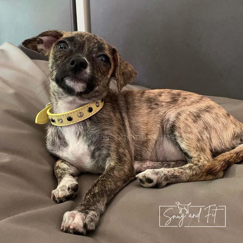 Snug & Fit ha deciso di chiamare con questo nome questi collari perchรฉ gli strass sulla pelle giallo ricordano proprio le goccioline di acqua di condensa sulle foglie, e brillano e illuminano proprio come la rugiada in natura.