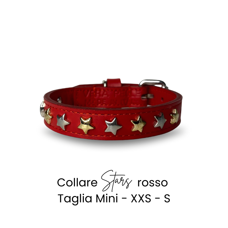 Il nuovo Collare cane STARS in vera pelle rossa con borchie a stella argentate e dorate รจ un must per le vostre occasioni speciali . Il vostro amico sarร bellissimo ed elegantissimo! Abbinabile al guinzaglio, al porta sacchetti e al braccialetto per il padrone!
