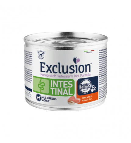 Umido dietetico Exclusion con maiale e riso per cani con sensibilità intestinali e problemi digestivi.