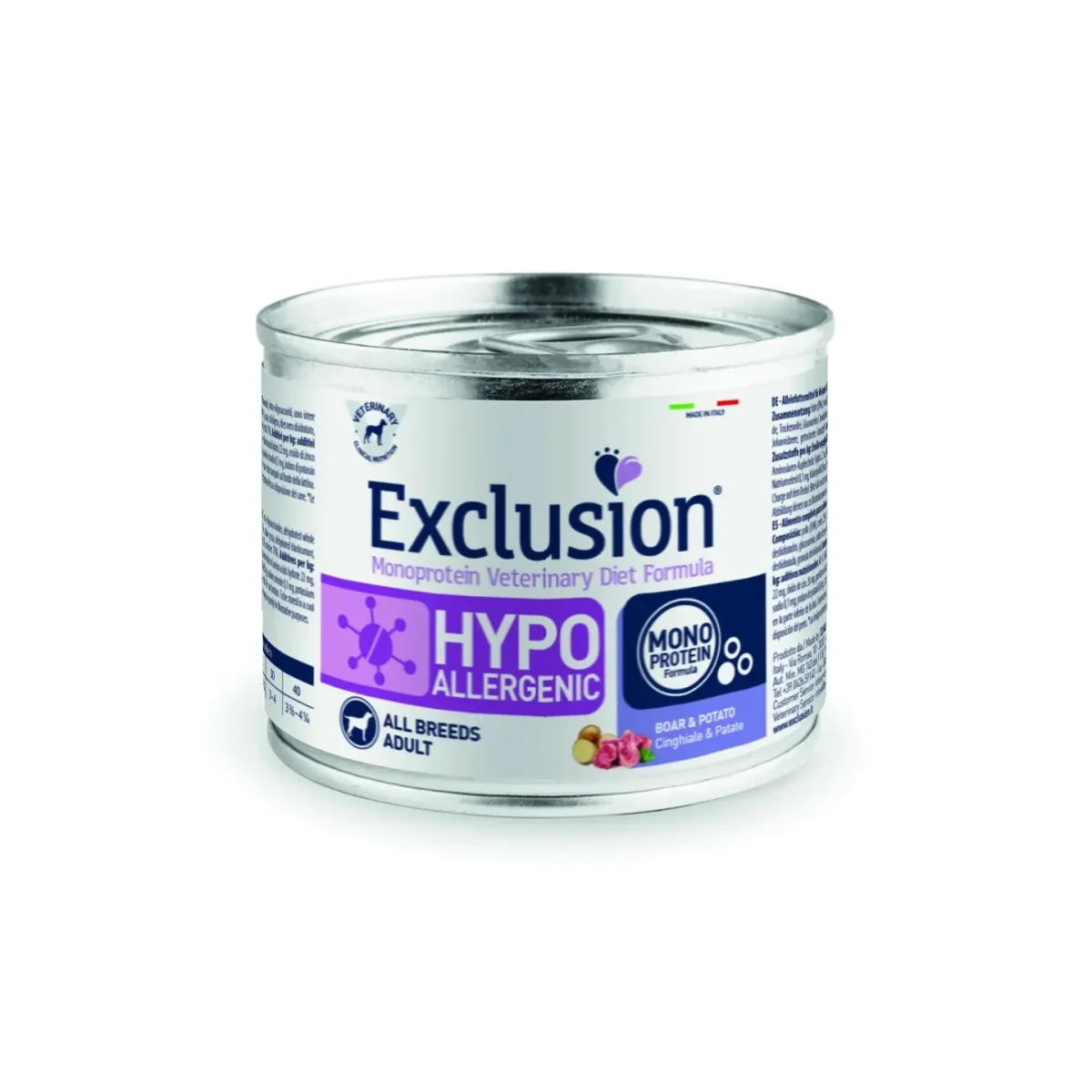 Exclusion Monoprotein Vet Diet Hypoallergenic Cingiale e Patate All Breeds è un alimento completo dietetico in formato monoproteico studiato per cani con intolleranze alimentari. Formulato con carne di cinghiale e patate, è ideale per ridurre i rischi di reazioni avverse al cibo. Questa formula ipoallergenica è priva di cereali, glutine e conservanti artificiali, rendendola perfetta per cani con sensibilità digestive. La presenza di aloe vera e altri ingredienti naturali supporta la salute del sistema immunitario e promuove una pelle sana e un pelo lucido.