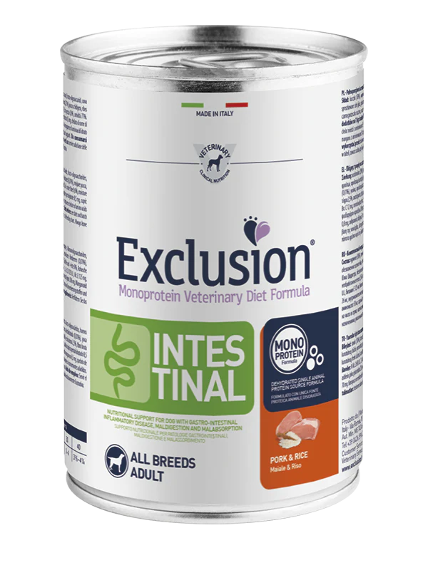 Exclusion Diet Intestinal è un alimento umido di alta qualità progettato per offrire al tuo cane un’alimentazione dietetica mirata e bilanciata, specialmente per cani con disturbi gastro-intestinali. Questo alimento è formulato con carne di maiale come unica fonte proteica, abbinata al riso come fonte di carboidrati, rendendo il prodotto altamente digeribile e adatto per cani con sensibilità alimentari. Grazie agli ingredienti accuratamente selezionati, Exclusion Diet Intestinal aiuta a mantenere l’equilibrio e la salute intestinale del tuo cane.
