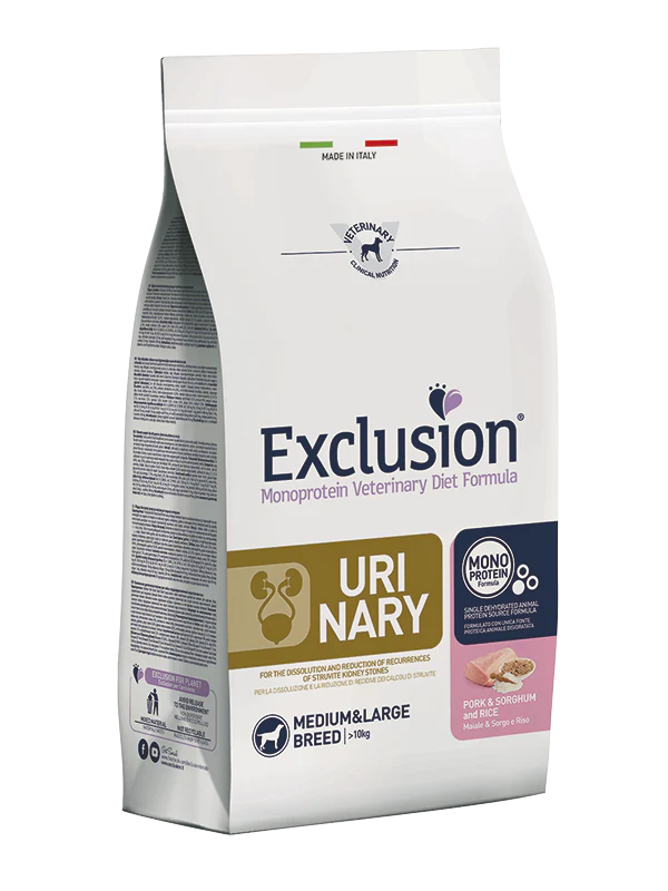 L’Exclusion Urinary Maiale, Sorgo e Riso per Razze Medio-Grandi 2kg è un alimento dietetico completo formulato specificamente per la dissoluzione dei calcoli a base di struvite e per la riduzione delle recidive di calcoli di struvite nei cani di razza media e grande. Questo alimento monoproteico, a base di carne di maiale come unica fonte proteica animale, è arricchito con sorgo e riso per fornire un apporto bilanciato di nutrienti, contribuendo al benessere generale del tuo cane. Grazie alla sua formulazione a basso contenuto di magnesio e pH acidificante, è ideale per mantenere la salute delle vie urinarie del tuo cane.