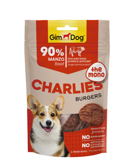 I Charlie’s The Mono Burgers al Manzo di GimDog sono snack morbidi monoproteici a forma di mini hamburger, perfetti per premiare il tuo cane con gusto e sicurezza. Formula con unica fonte proteica, ideali per cani sensibili o con intolleranze alimentari.