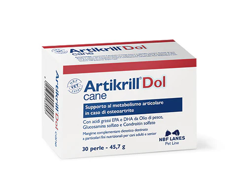 Artikrill DOL cane è un mangime complementare dietetico formulato con acidi grassi Omega-3 (EPA) da olio di pesce e con un livello adeguato di Vitamina E per il supporto al metabolismo articolare in caso di osteoartrite del cane.