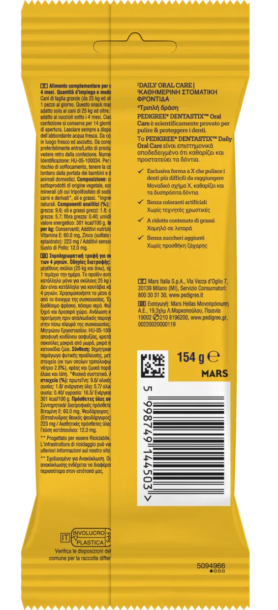 Pedrigree Dentastix Large 4pz 154gr è uno snack dentale pensato per cani adulti di taglia grande, ideale per chi vuole inserire un gesto semplice e costante nella routine quotidiana di igiene orale. La masticazione diventa un momento piacevole e “funzionale”, utile per affiancare le normali abitudini di cura del cane con un premio pratico da offrire ogni giorno. Questo prodotto si propone come ricompensa dopo la passeggiata o come rituale fisso a fine giornata, perché è facile da somministrare e non richiede preparazioni. È un alimento complementare, quindi non sostituisce il pasto: si integra nella dieta quotidiana tenendo sotto controllo l’apporto totale di snack e lasciando sempre acqua fresca disponibile.