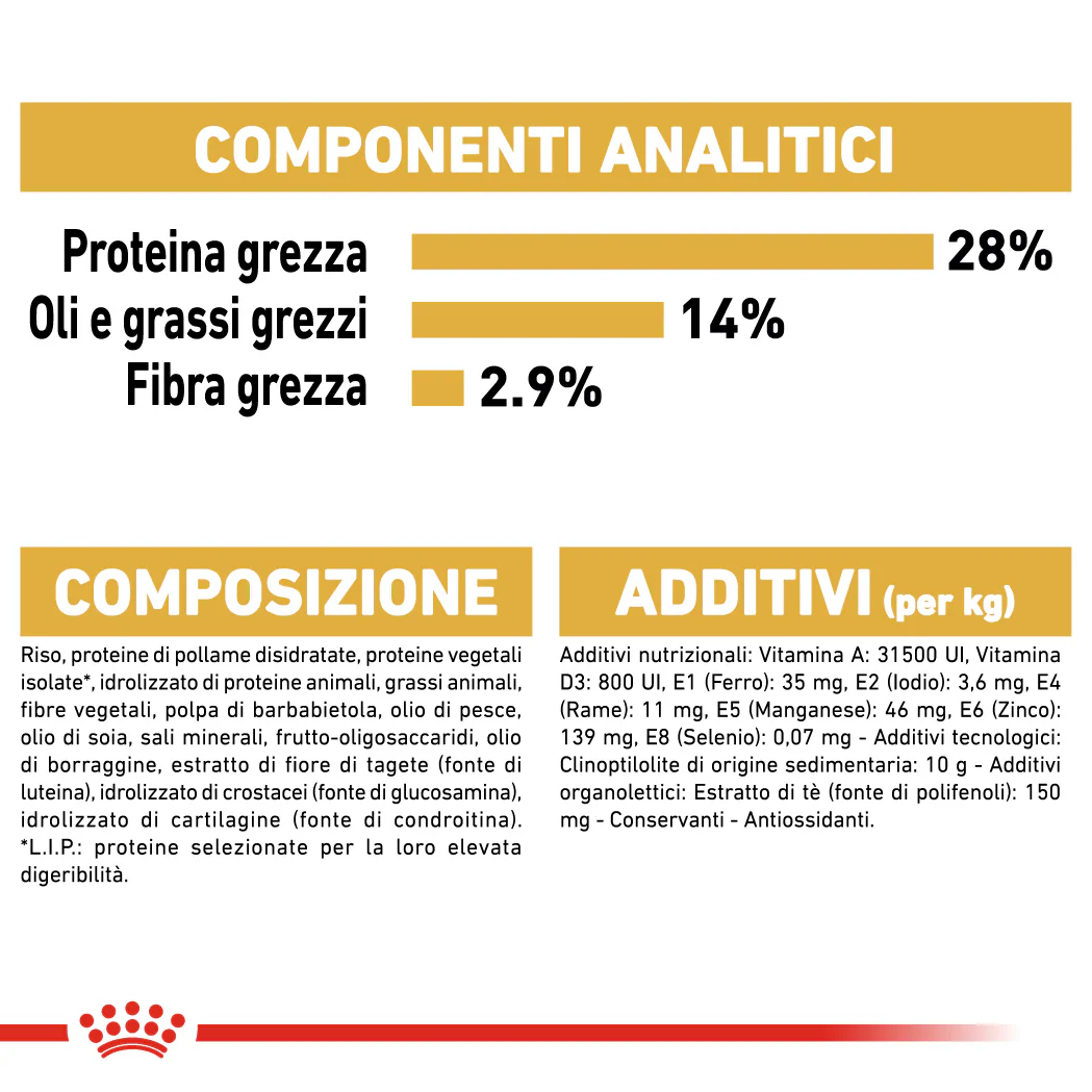 Ingredienti: riso, proteine di pollame disidratate, proteine vegetali isolate*, idrolizzato di proteine animali, grassi animali, fibre vegetali, polpa di barbabietola, olio di pesce, olio di soia, sali minerali, frutto-oligosaccaridi, olio di borragine, estratto di fiore di Tagete (fonte di luteina), idrolizzato di crostacei (fonte di glucosamina), idrolizzato di cartilagine (fonte di condroitina).
