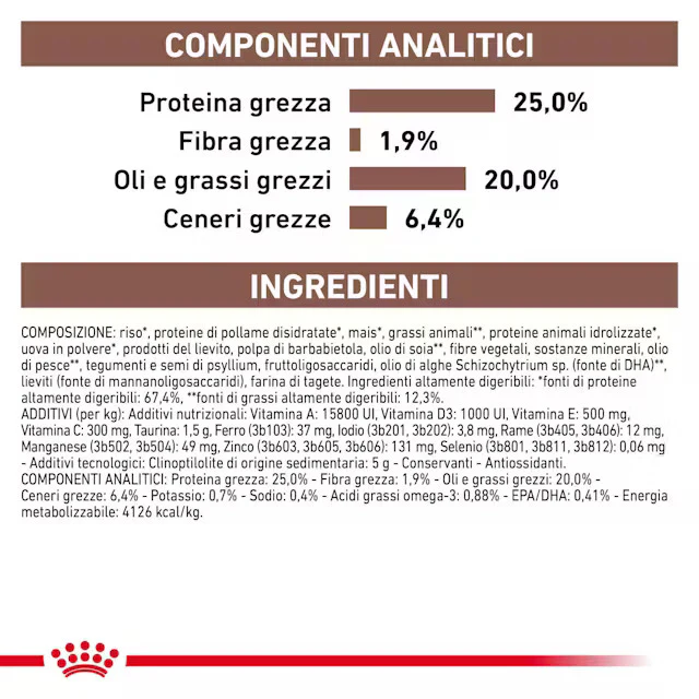 COMPOSIZIONE: riso*, proteine di pollame disidratate*, mais*, grassi animali**, proteine animali idrolizzate*, uova in polvere*, prodotti del lievito, polpa di barbabietola, olio di soia**, fibre vegetali, sostanze minerali, olio di pesce**, tegumenti e semi di psyllium, fruttoligosaccaridi, olio di alghe Schizochytrium sp. (fonte di DHA)**, lieviti (fonte di mannanoligosaccaridi), farina di tagete. Ingredienti altamente digeribili: *fonti di proteine altamente digeribili: 67,4%, **fonti di grassi altamente digeribili: 12,3%.