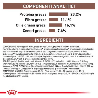 fibre vegetali, riso, grassi animali, proteine di pollame disidratate, mais, frumento, glutine di mais, proteine di maiale disidratate*, glutine di grano*, sali minerali, fegatini di pollame idrolizzati, polpa di barbabietola, olio di soia, olio di pesce, tegumento e semi di psillio, prodotti di lieviti, idrolizzato di proteine animali, frutto-oligosaccaridi (0,48%), idrolizzato di lieviti (fonte di mannano-oligosaccaridi) (0,19%), estratto di fiore di tagete (fonte di luteina).