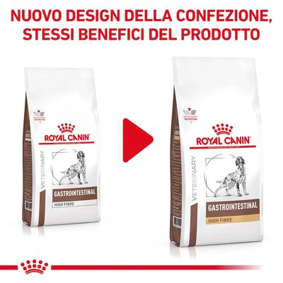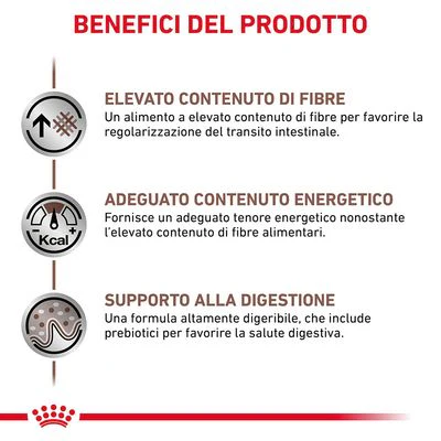Come funziona Royal Canin Gastrointestinal High Fibre Veterinary? Questo alimento utilizza un mix ottimale di fibre alimentari per favorire la regolarizzazione del transito intestinale e include prebiotici per sostenere una sana flora intestinale.