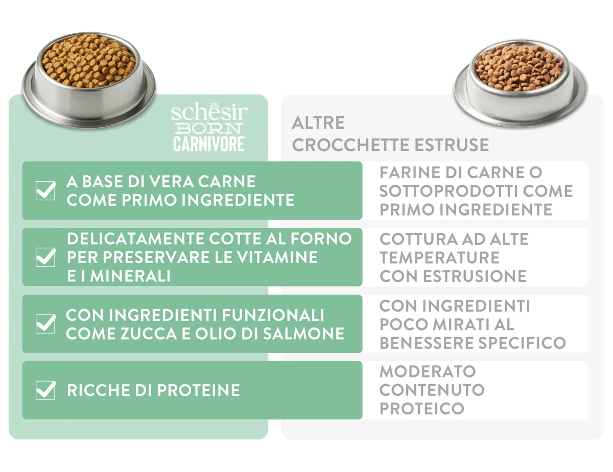 Somministrare secondo le dosi indicate, da solo o in combinazione con umido Schesir. Passare gradualmente a questo alimento.