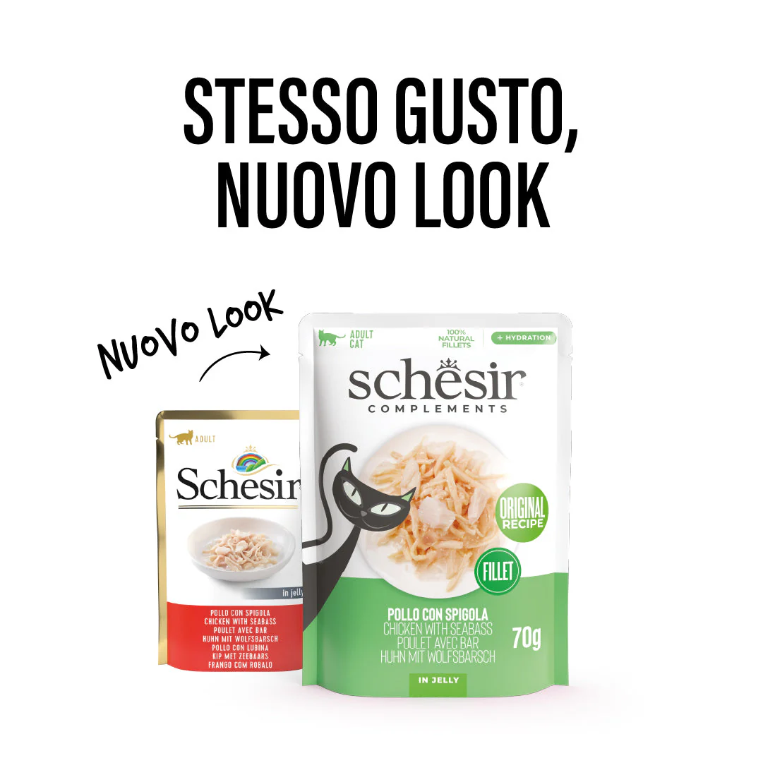Schesir Gatto Pollo con Spigola 70g Busta è un alimento umido complementare pensato per garantire al tuo gatto gusto, qualità e naturalezza in ogni pasto. Realizzato con veri filetti di pollo e un tocco raffinato di spigola, questo prodotto è preparato con tecniche delicate come la cottura a vapore e la lavorazione a mano, per conservare tutto il sapore e le proprietà nutritive degli ingredienti. La consistenza morbida e l’elevata appetibilità lo rendono ideale anche per i gatti più esigenti o con difficoltà alimentari. Senza aggiunta di coloranti, conservanti o aromi artificiali, Schesir garantisce un pasto sano e sicuro. Il formato in busta da 70g è pratico e pensato per mantenere la freschezza fino all’apertura, perfetto per servire una porzione controllata e gustosa.