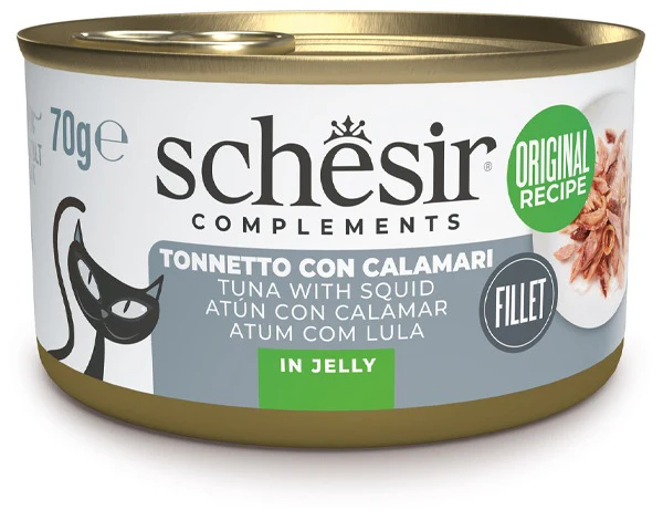 Schesir Gatto Tonnetto con Calamari in Jelly 70g Lattina è una deliziosa proposta di alimento umido per gatti adulti, ideale per variare la dieta quotidiana con gusto e ingredienti di qualità . La ricetta unisce la delicatezza del tonnetto alla consistenza unica dei calamari, offrendo una combinazione marina ricca di proteine nobili e altamente digeribili. L’aggiunta della gelatina naturale (jelly) non solo rende il pasto più appetitoso, ma favorisce anche una corretta idratazione, aspetto essenziale per il benessere delle vie urinarie del gatto.