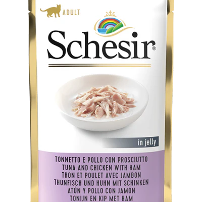 La ricetta Schesir è a base di veri filetti di tonnetto e pollo, abbinati a un gustoso topping di prosciutto, per un invitante incontro di sapori. La preparazione è in gelatina, per soddisfare i gusti dei gatti che prediligono un sapore naturale, ma con una consistenza più compatta nella ciotola.