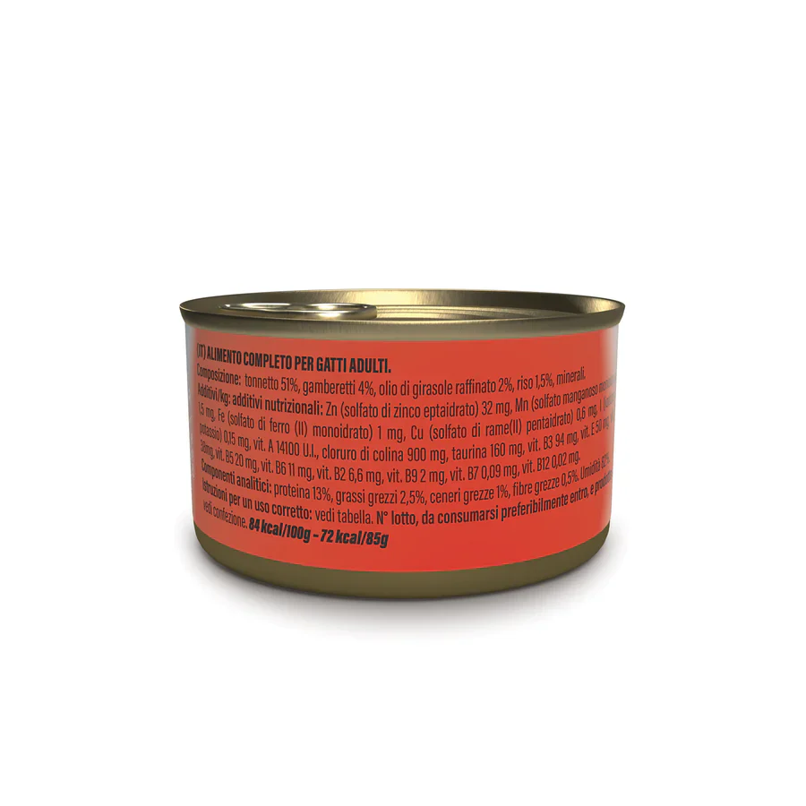 Filetti di tonnetto, gamberetti, gelatina vegetale, vitamine e taurina. Ricetta priva di coloranti e conservanti.