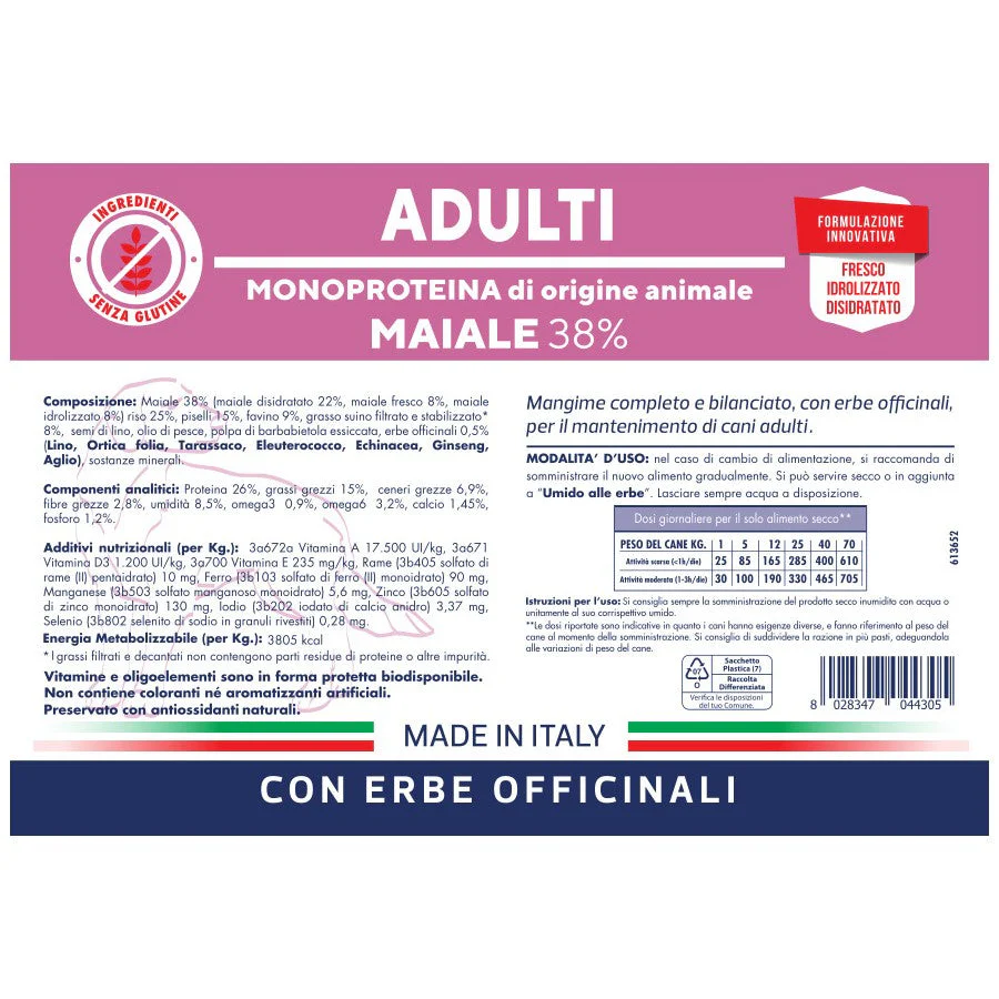 Maiale 38% (maiale disidratato 22%, maiale fresco 8%, maiale idrolizzato 8%), riso 25%, piselli 15%, favino 9%, grasso suino filtrato e stabilizzato* 8%, semi di lino, olio di pesce, polpa di barbabietola essiccata, erbe officinali (0,5%) (Lino, Ortica folia, Tarassaco, Eleuterococco, Echinacea, Ginseng, Aglio), sostanze minerali.