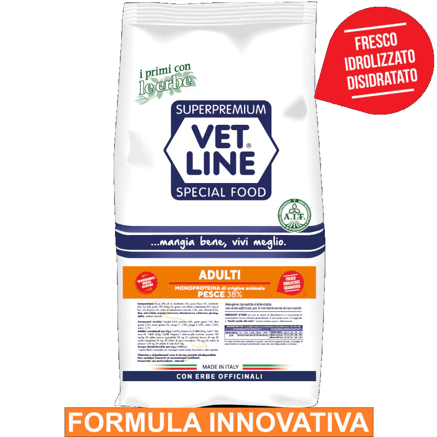 Vet Line Adulti Pesce è un mangime completo e bilanciato, perfetto per il mantenimento di cani adulti. Con il 38% di pesce come ingrediente principale, questa formula offre un pasto nutriente e appetitoso, arricchito con erbe officinali per supportare la salute generale del tuo cane. L’uso di pesce come fonte principale di proteine fornisce una dieta ricca di nutrienti essenziali, ideale per cani adulti di tutte le razze e taglie.