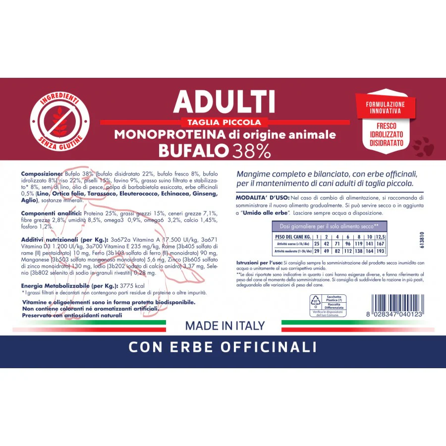 Composizione: Bufalo 38% (bufalo disidratato 22%, bufalo fresco 8%, bufalo idrolizzato 8%), riso 22%, piselli 15%, favino 9%, grasso suino filtrato e stabilizzato* 8%, semi di lino, olio di pesce, polpa di barbabietola essiccata, erbe officinali 0,5% (Lino, Ortica folia, Tarassaco, Eleuterococco, Echinacea, Ginseng, Aglio), sostanze minerali.