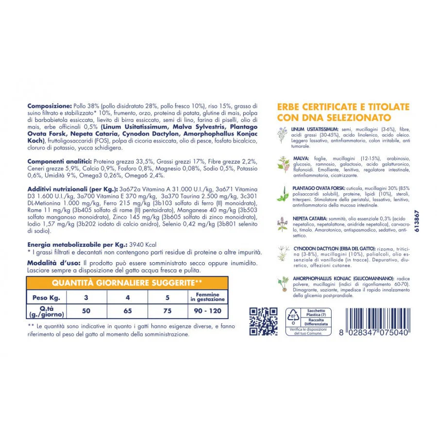 Pollo 38% (pollo disidratato 28%, pollo fresco 10%), riso 15%, grasso suino filtrato e stabilizzato* 10%, frumento, orzo, proteina di patata, glutine di mais, polpa di barbabietola essiccata, lievito di birra essiccato, semi di lino, farina di piselli, olio di mais, erbe officinali 0,5% (Linum Usitatissimum, Malva Sylvestris, Plantago Ovata Forsk, Nepeta Cataria, Cynodon Dactylon, Amorphophallus Koniac Koch), fruttoligosaccaridi (FOS), polpa di cicoria essiccata, olio di pesce, fosfato bicalcico, cloruro di potassio, yucca schidigera.