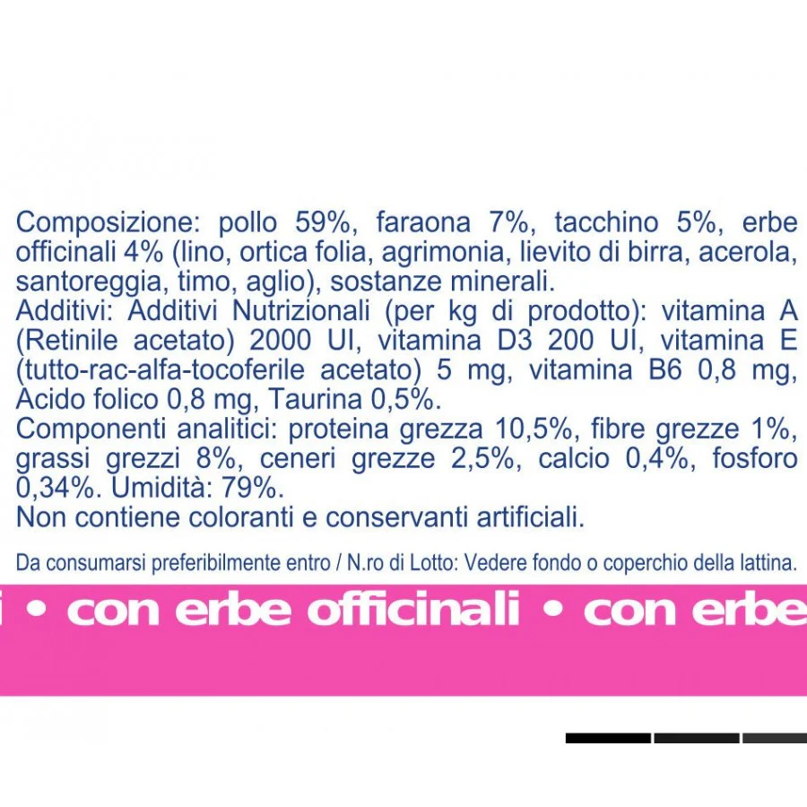 Pollo 59%, faraona 7%, tacchino 5%, erbe officinali 4% (Lino, Ortica Folia, Agrimonia, Lievito di birra, Acerola, Santoreggia, Timo, Aglio), sostanze minerali.
