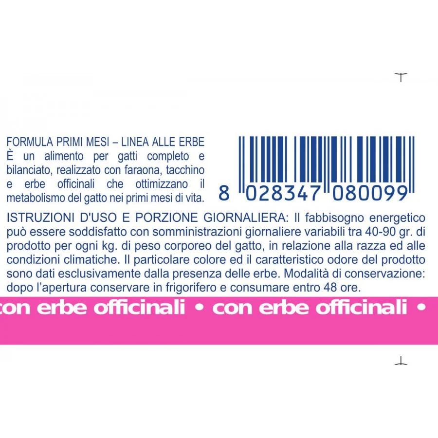 L’integrazione di 8 erbe officinali è analoga a quella utilizzata nella formulazione Primi Mesi secco, per un perfetto abbinamento dei due prodotti:
